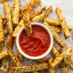 I love serving these Air Fryer Zucchini Fries right away, while they are still hot and incredibly crispy. Pile them onto a large wooden board or a white platter for a beautiful contrast. I usually dust them with a tiny pinch of flaky sea salt and freshly cracked black pepper right before serving—it adds a wonderful finishing touch. On the side, I always offer at least two dipping sauces. My go-to combination is a warm marinara sauce (the tanginess cuts through the richness beautifully) and a cool, herby ranch dressing or aioli. For a Moroccan twist, I sometimes make a quick harissa yogurt dip—mix ½ cup plain Greek yogurt with 1 tablespoon harissa paste and a pinch of salt. The smokiness pairs stunningly with the Parmesan coating.