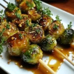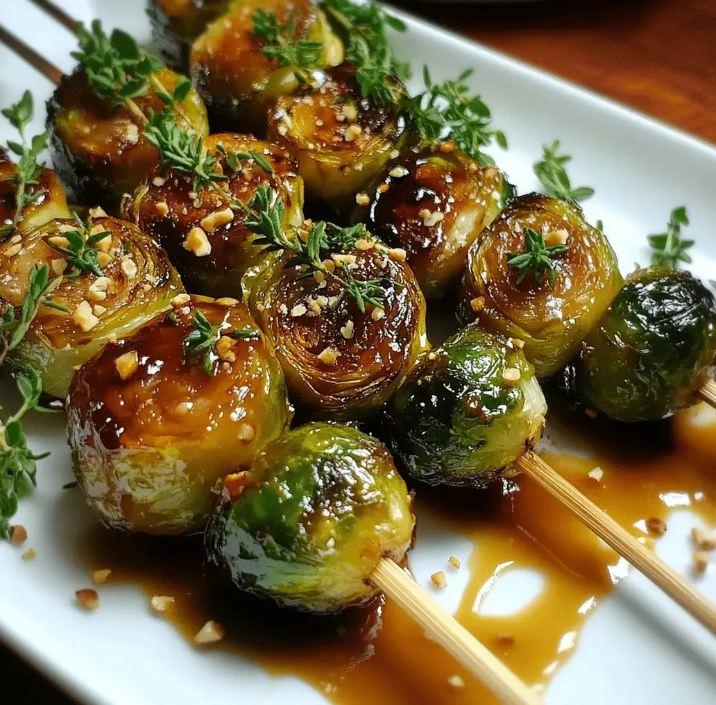 6. Thread 4-5 sprouts onto each skewer, then drizzle the warm glaze over them. Garnish with fresh thyme if desired.