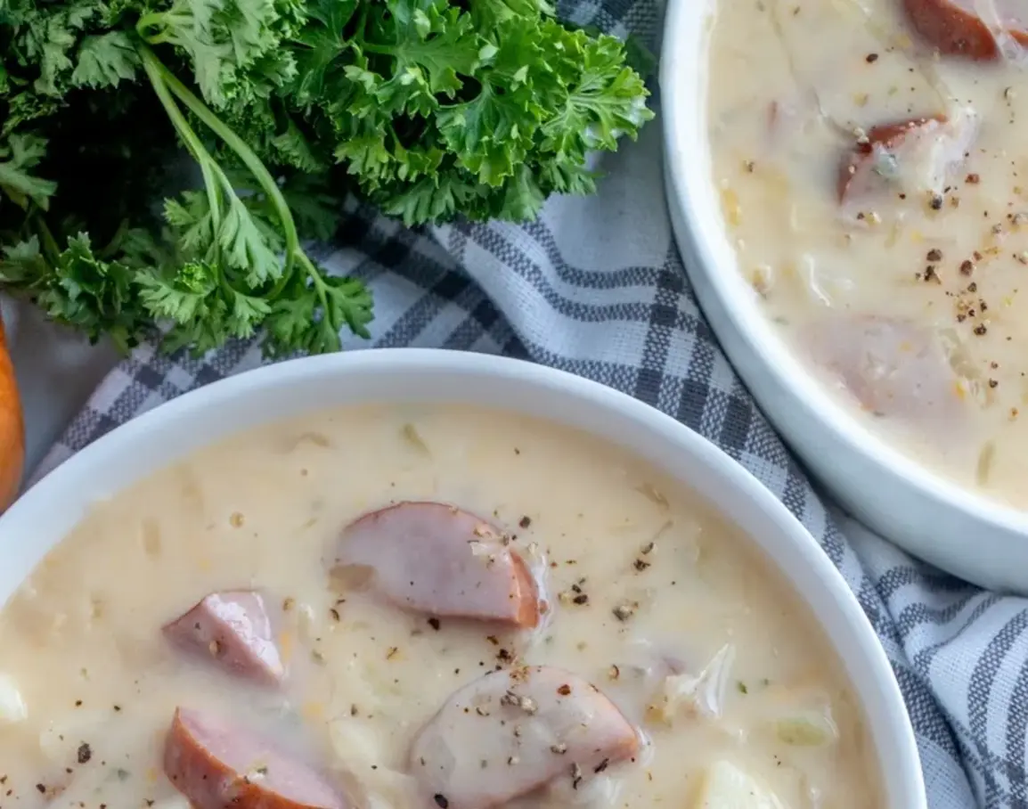 A hearty and comforting soup featuring kielbasa sausage, potatoes, and tangy sauerkraut in a creamy, cheesy broth.