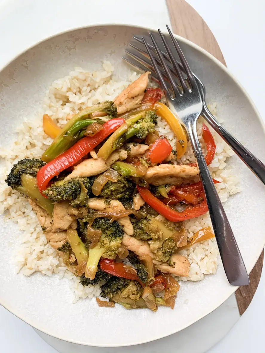 Need an easy and healthy dinner recipe? Easy Chicken Stir Fry with vegetables is your answer. This asian inspired dish is made with broccoli, bell peppers, ginger, and a delicious honey garlic sauce. It is perfect served over rice for an easy weeknight dinner or even as meal prep!