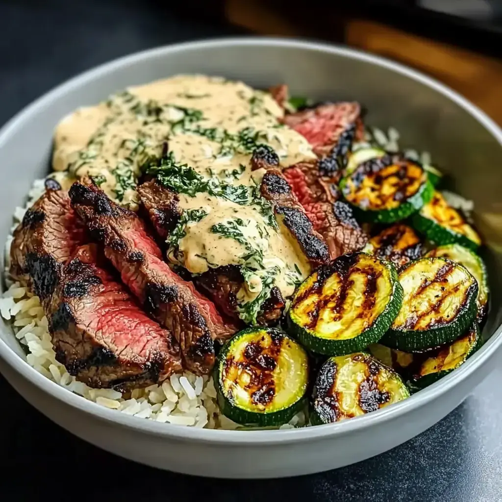 - Assemble the bowl with a base of rice or mashed potatoes, topped with grilled zucchini and sliced steak. Drizzle with herb sauce.