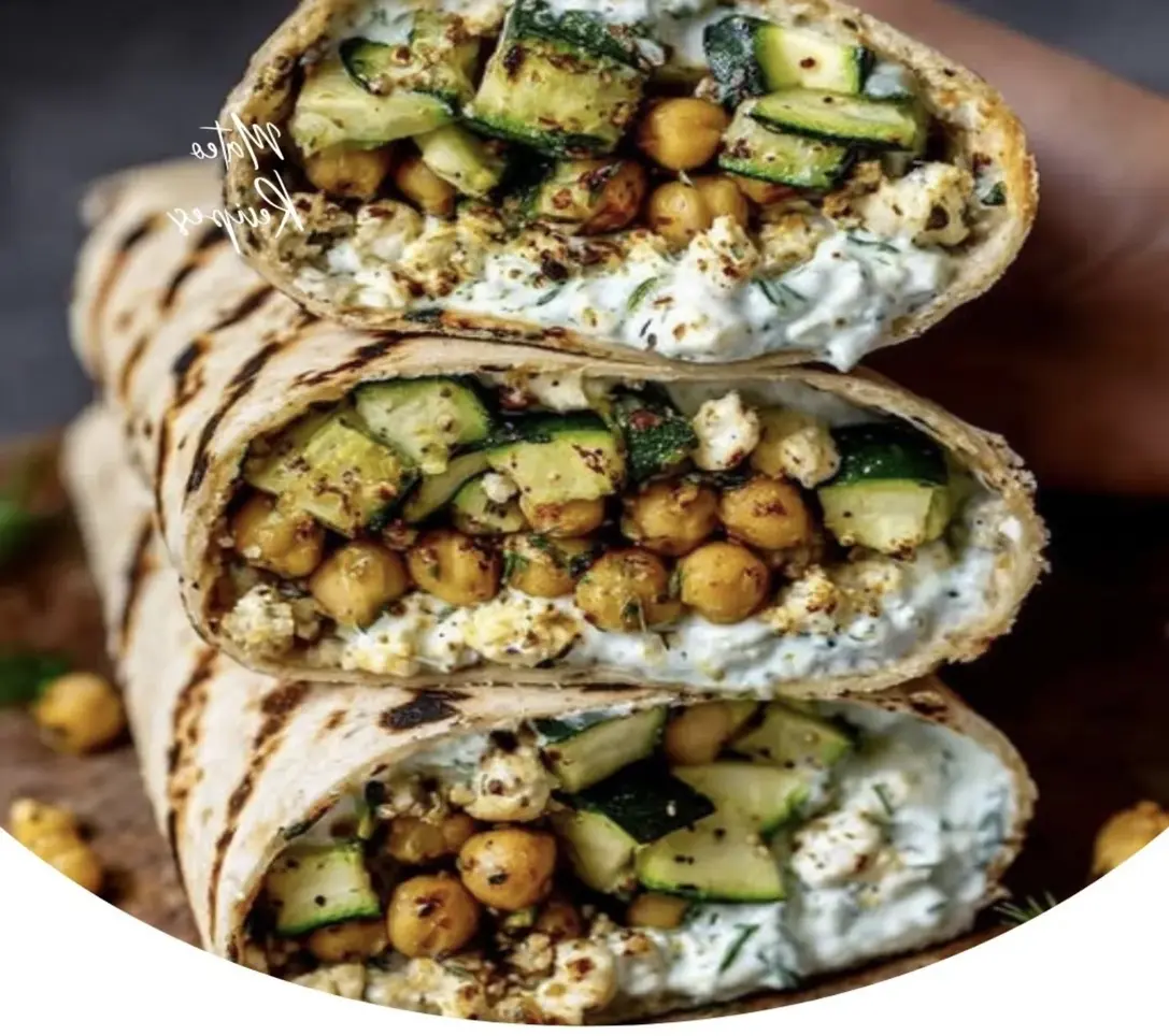 A delicious and healthy wrap featuring grilled zucchini, creamy feta, spiced chickpeas, and a refreshing herbed yogurt sauce.