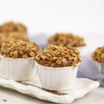 - In another bowl, mix the oats, cinnamon, brown sugar, and melted butter to make the topping. Sprinkle this mixture evenly over the muffin batter.