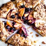 Picture a buttery, almond‑dusted crust that curls around pockets of sliced peaches, plums, and plump blueberries, each flake of fruit glistening with a gentle honey mist. The aromatic medley of fresh peach, tart blueberry, and a whisper of rosewater from the almond dough creates a fragrant steam that rolls through the kitchen, filling the air like the scent of orange blossoms on a warm July evening. Texturally, you’ll notice the crust’s tender flakiness contrasted by the juicy burst of fruit, and the sweet caramelized rim that offers a satisfying snap with every bite.
