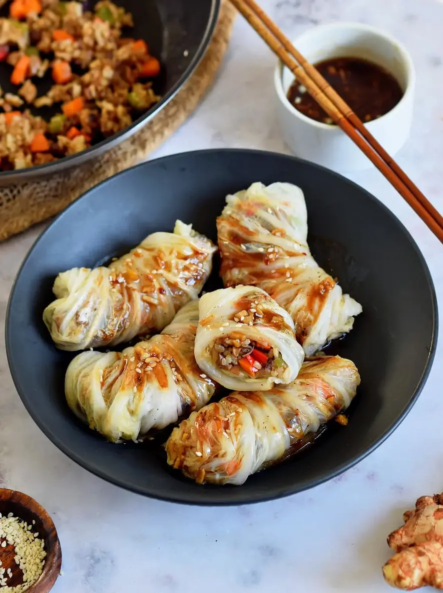 Imagine biting into a soft, slightly sweet cabbage leaf that gives way to a savory, umami-packed filling of sticky sushi rice, crisp carrots, peppers, and earthy mushrooms. The magic, however, is in the final drizzle: a glossy, aromatic Chinese brown garlic sauce that’s sweet, tangy, and deeply savory all at once. The scent of ginger and garlic sizzling in sesame oil will fill your kitchen with an aroma that’s both comforting and exciting. This recipe delivers a beautiful contrast of textures and a symphony of flavors that feels gourmet yet completely approachable.